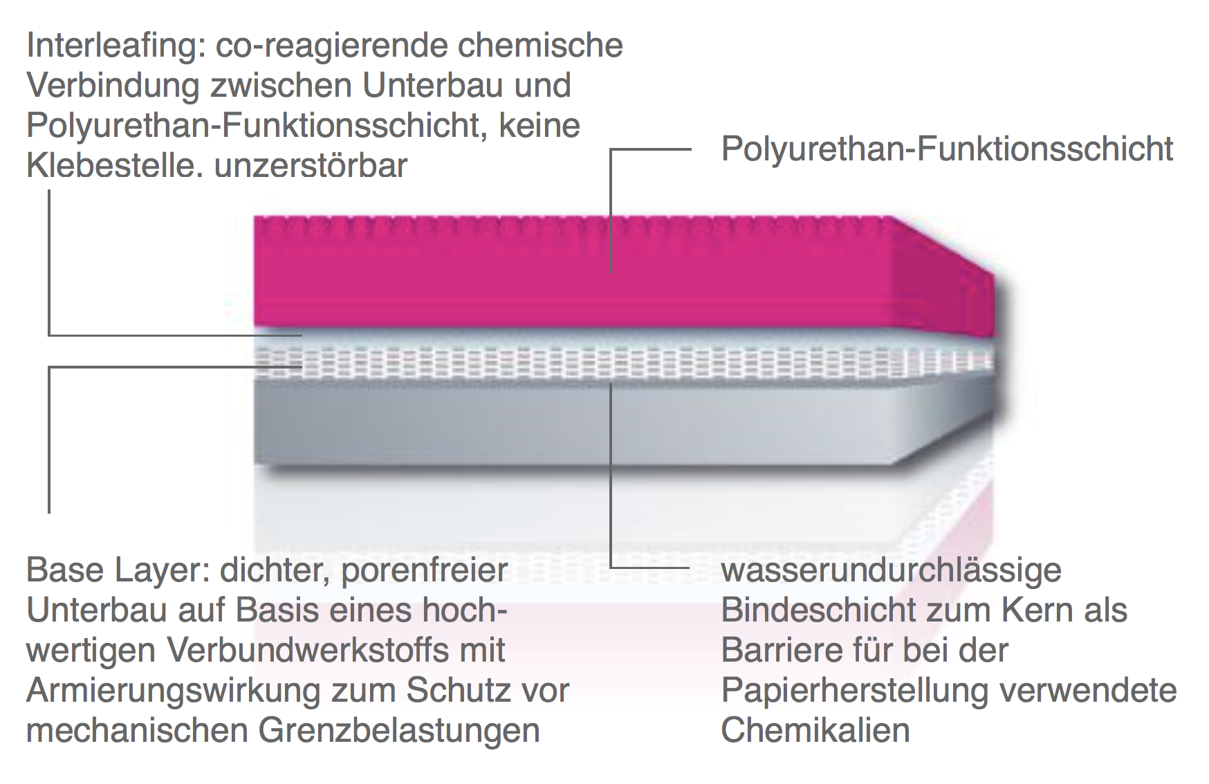 Unser Kernbindungssystem ist bereits seit vielen Jahren bewährt und funktioniert klaglos in Hunderten von Press- und Saugpresswalzenbezügen. Konsequenterweise wird es auch beim cyclus 3-Bezug eingesetzt. Das mehrschichtige Bindungssystem ist das Ergebnis jahrelanger Erfahrung und bodenständiger technologischer Weiterentwicklung. Der beste Beweis dafür, dass es funktioniert, ist die Tatsache, dass es seit der Einführung unserer Polyurethanbezüge noch nicht eine einzige Ablösung gegeben hat – für uns eine Selbstverständlichkeit.
