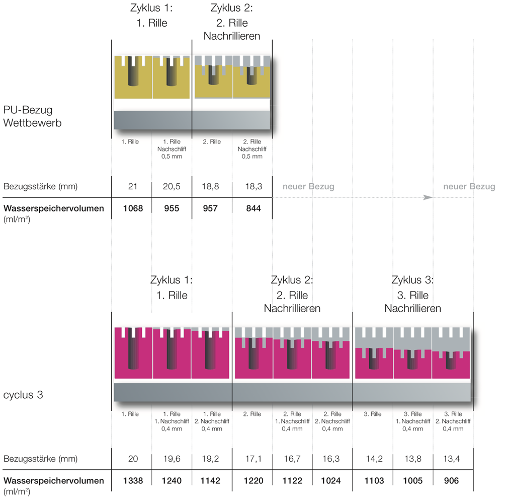cyclus 3-Bezüge von SchäferRolls können 3 mal mit einer Rille von jeweils bis zu 3 mm Tiefe ausgestattet werden. Das bedeutet für Sie, dass Sie Ihren Bezug einmal mehr nachrillieren können, bevor er gegen einen ganz neuen ausgetauscht werden muss. In Zahlen ausgedrückt: Durch die 3 Lebenszyklen verringern sich Ihre „Total Cost of Ownership“ um 50%.